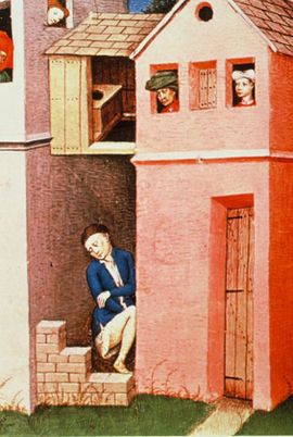 Как вы понимаете, латринная кабинка изнутри не благоухала розами; впрочем, достаточное представление о подобном может составить себе любой, хотя бы раз в жизни использовавший сельский «скворечник», и посему, острые на язык тогдашние городские жители, не без юмора именовали улицы, где располагались общественные латрины «дерьмовыми». Впрочем, в большом городе на 200—400 тыс. жителей (а в Позднем Средневековье это было отнюдь не в диковинку!) подобных улиц поневоле приходилось устраивать несколько, и местные жители вовсю изощрялись в остроумии. В частности, в Париже во XIII—XIV вв. наличествовали улицы, чьи имена несколько вольно можно перевести как Дерьмовая, Дерьмяная и Дерьмишная, улица Смердящая Дерьмом, попросту и без прикрас улица Дерьма и неподалеку от нее улица Пи-пи. Посмеявшись над подобными лингвистическими упражнениями, проследуем далее.