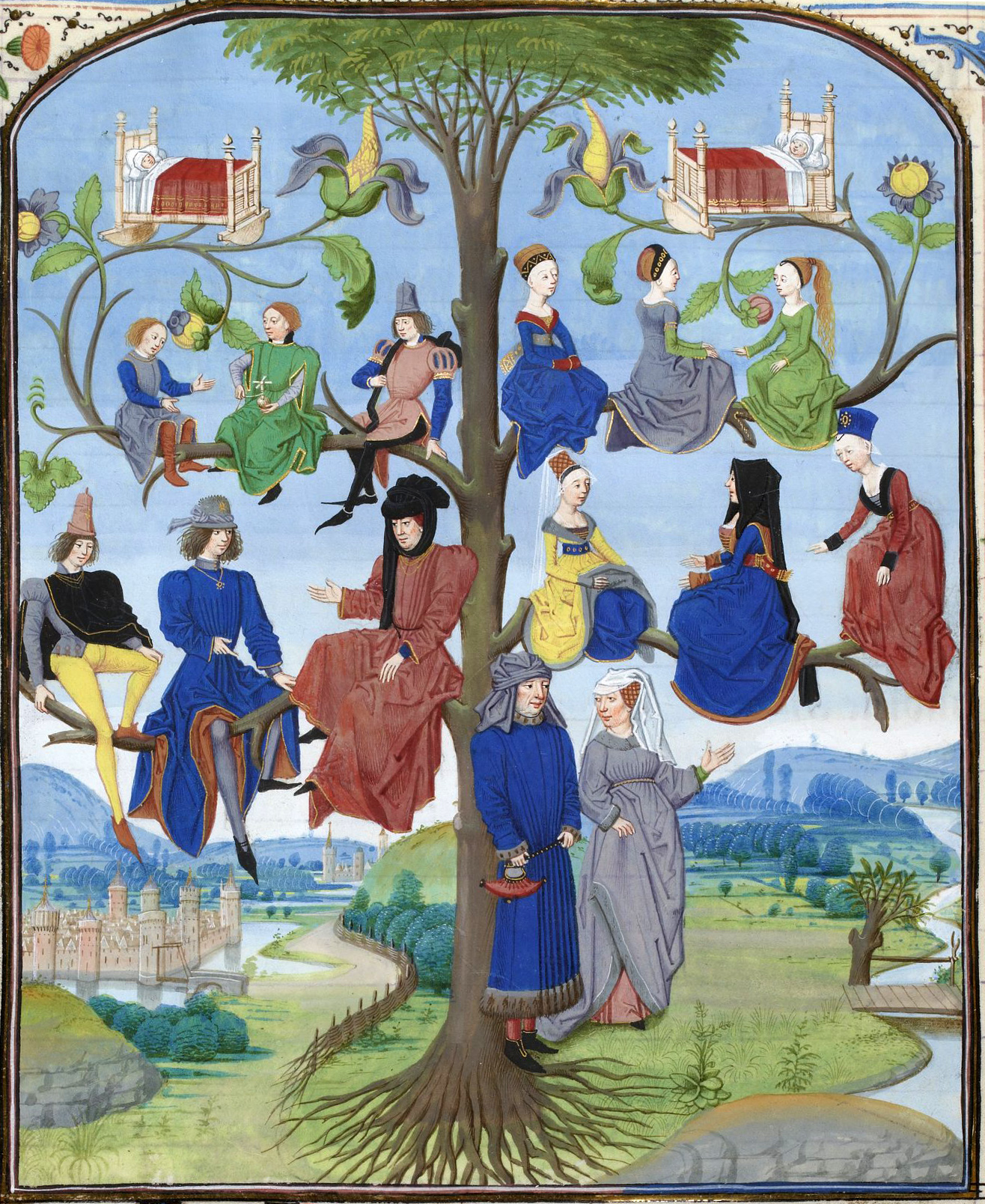| «Свод законов о сельских владениях» (BnF Fr. 202), лист 15, обратная сторона: древо родства | Gallica | 1471[1] | Луазет Лиде[2] |