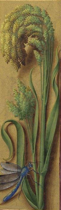 Просо. Опять стрекоза с прозрачными крыльями и множество крошечных семян, каждое из которых прорисовано со всей тщательностью. Можно только подивиться терпению и работоспособности мастера.