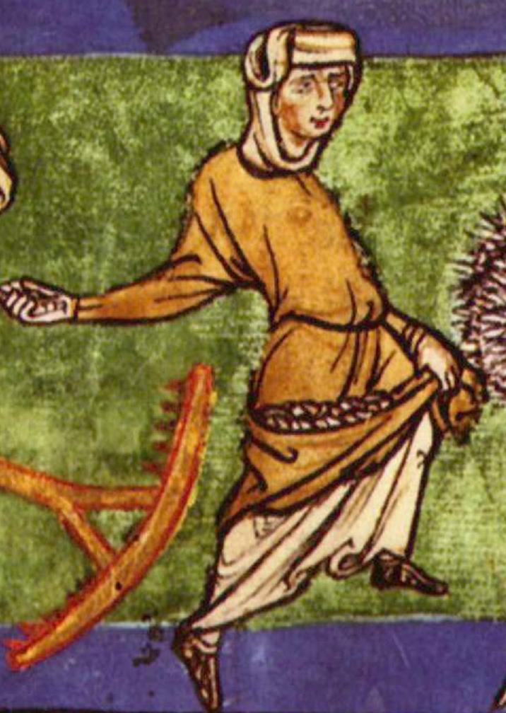 Миниатюра в аллегорической показывает четыре средневековых возраста женщины - девочка, девушка, замужняя дама, старуха, причем каждый из них связан с одной из стадий ухода за пшеницей. Миниатюра "посев" изображает новобрачную, в характерной головной повязке - которую по обычаю должны были носить законные супруги.