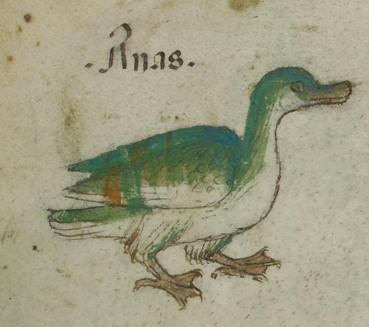 Изображение взято из характерного для позднего Средневековья «Бестиария» - энциклопедии реальных и вымышленных животных и птиц. Книга написана на латинском языке, потому рядом с изображением утки присутствует ее латинское наименование «Anas».